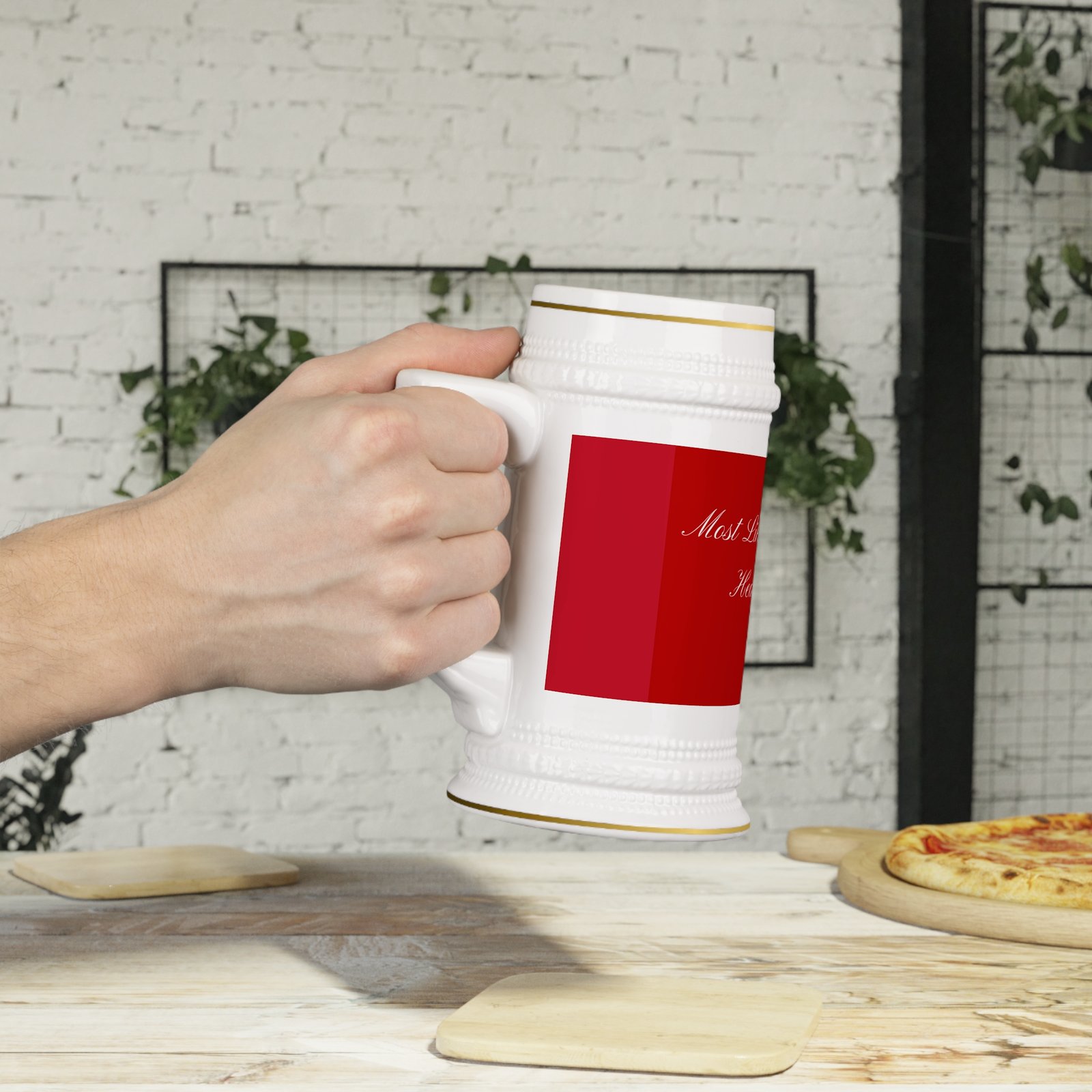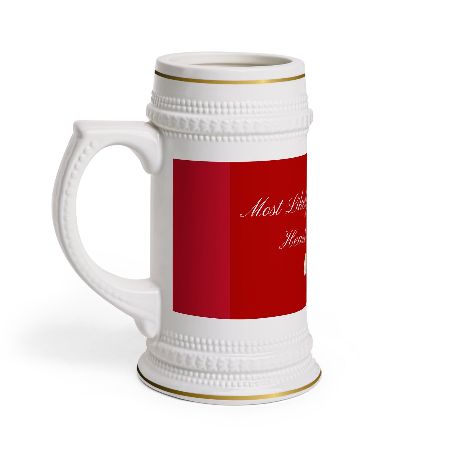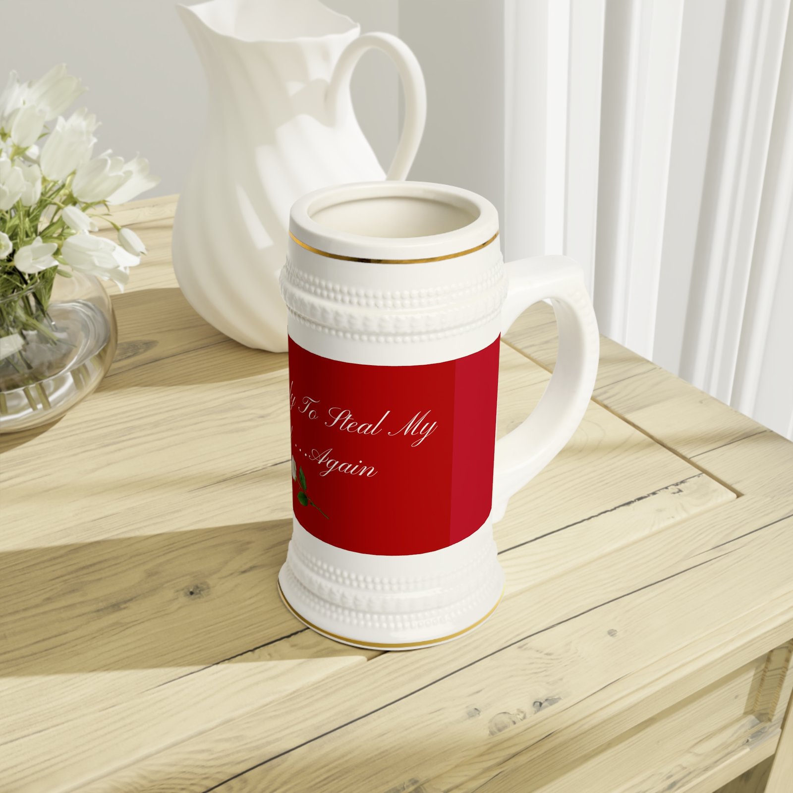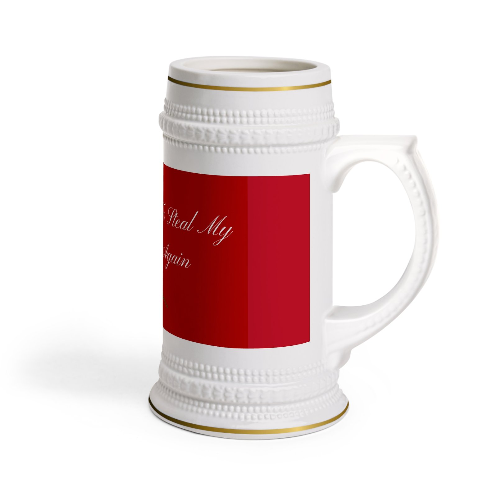 This ceramic stein brings a touch of old-world charm to weekday mornings and late-night toasts. Its tall, sculpted form and ribbed detailing feel steady in hand — like something handed down at cozy gatherings. The glossy white surface makes the deep red design sing, while gold-trim accents lend a quietly elegant note. It warms up quickly in the microwave and cleans easily in the dishwasher, so it moves from ritual to cleanup without fuss. Whether sipped from while journaling at dawn or passed around a small circle of friends, this stein fits moments that linger a little longer.