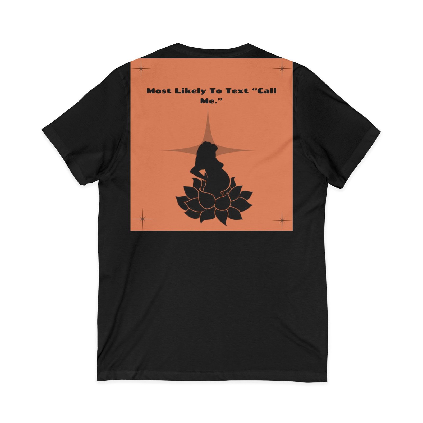 This lightweight V-neck tee brings quiet confidence to your everyday wardrobe. The front-and-back graphic frames a silhouetted figure seated atop a layered lotus, set against a warm, terracotta square and captioned with a tongue-in-cheek line that reads “Most Likely To Text ‘Call Me.’” It feels like a late-afternoon pause — mellow hues, soft cotton against your skin, and an easy silhouette that layers well or stands on its own. Built with attention to fit and finish, the retail-cut V-neck flatters without fuss and the breathable 100% cotton (or cotton-blend heathers) keeps you comfortable through coffee runs, gallery hangs, or low-key nights out. Thoughtfully made and tear-away labeled, the shirt blends subtle humor and calm, so it sits like a familiar companion in your rotation.